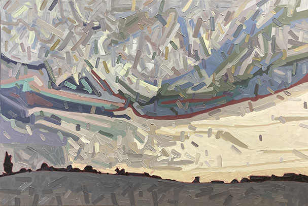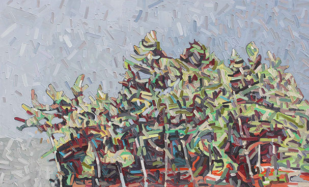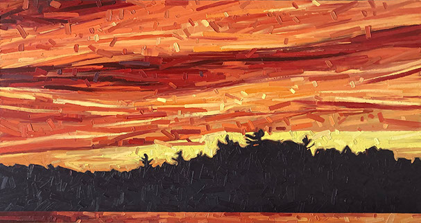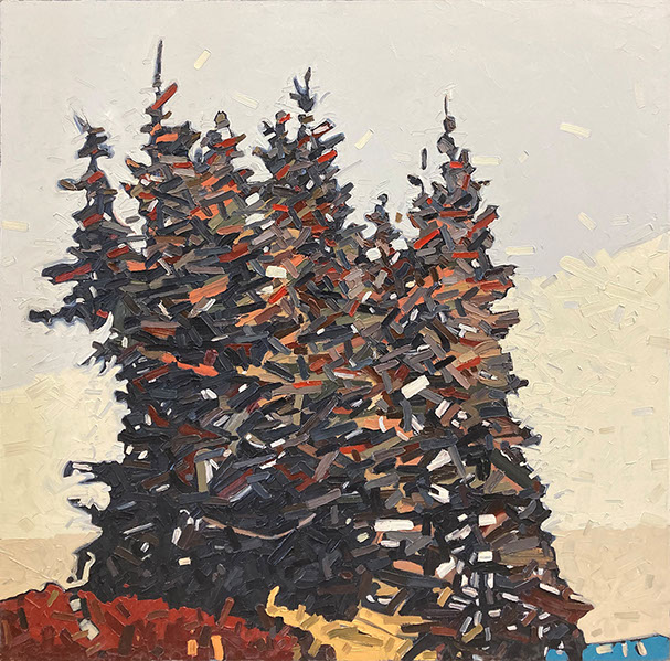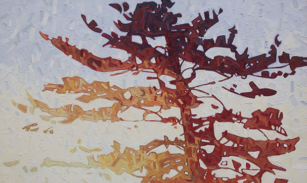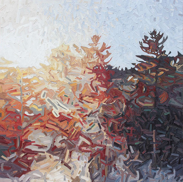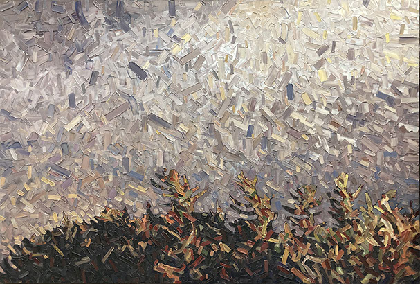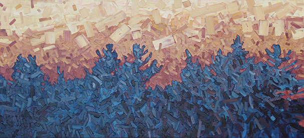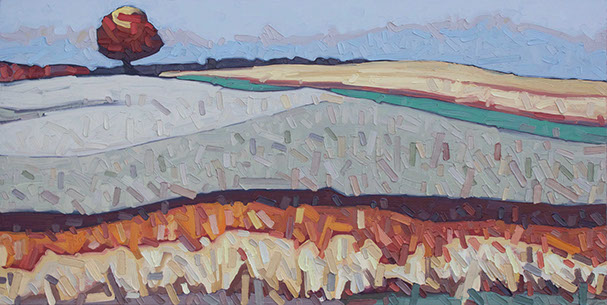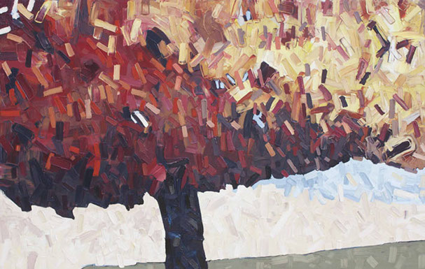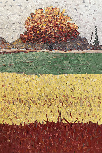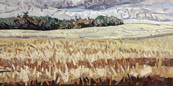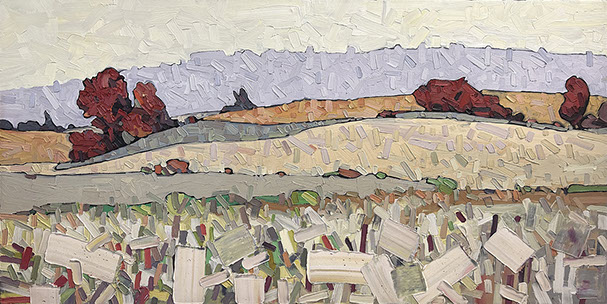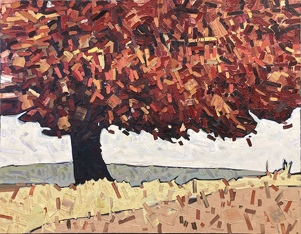 David’s inspiration comes from driving through the ever changing fields in Southern Ontario. He takes photos along the way and then uses these images to produce his paintings. He has developed his own unique and distinctive multi-layered technique, applying thick swaths of oil paint to create his own version of the “Contemporary Canadian Landscape” When not driving through rural Ontario, David Grieve’s inspiration also comes from walking along pathways through protected natural areas. Recalling the sense of tranquil beauty David says, “The path itself is like a metaphor for life. It is a journey from beginning to end, with ups and downs and twists along the way. The sun shines brightly through the open spaces in the canopy of trees, while in other areas, Icing, dark shadows are cast across the pathway. One thing is certain however, the end of the path opens into an expansive field, akin to Heaven, as our journey of life inevitably comes to an end.” The landscape paintings often focus on one solitary tree standing alone in an open space. His technique of cropping sections allows the observer to focus more carefully on one area without taking the entire piece for granted. The use of rich, organic, autumn colours represent the maturity of trees in the cycle of life. The beauty found in aspects of time and change is the ever present theme underlying the paintings he creates. Surrounded by trees and fields, David’s home studio in Brantford, Ontario, Canada keeps him close to his wife and three young sons. David has received scholarships and awards for his paintings, and has been involved in numerous group and solo exhibitions in commercial as well as public galleries across Canada and the U.S.A. David is represented by Natures Scene and currently exhibits in 17 galleries.