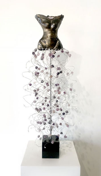 Estella Fransbergen - The beauty of the colors in the clay is created by the intensity of the fire. Each torso comes from the fire with a uniqueness all its own. This element of surprise and individuality celebrates the human form. In Celebration of Mother Nature… I “dress” the naked form of the torso to represent nature using feathers, branches, leaves, and gemstones. I use semi-precious and rare stones, formed over millions of years. Ancient science tells us that each stone has a symbolic meaning and our eyes detect the unique beauty of what lies within each. My sculptures reflect my total life experience. Born and raised in South Africa, studied art in the Netherlands, I now reside in the heartland of the United States. These experiences have exposed me to cultural diversity and the beauty of nature. My work is the expression of the human form… and the embodiment of beauty entwined with the powers of Nature.” – Estella Fransbergen Find the perfect piece to add to your art collection. You can view Estella Fransbergen’s art for sale below!