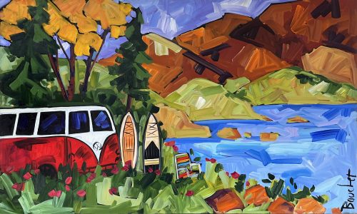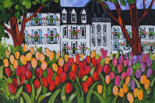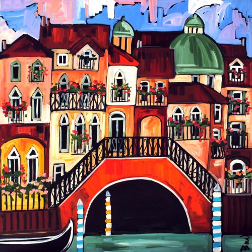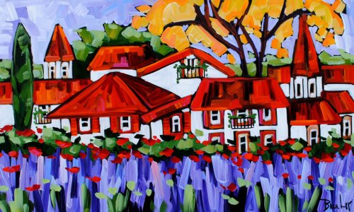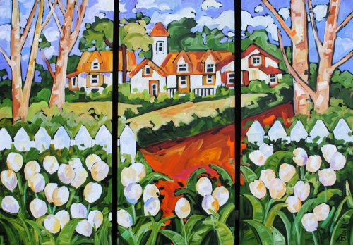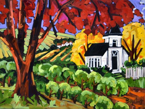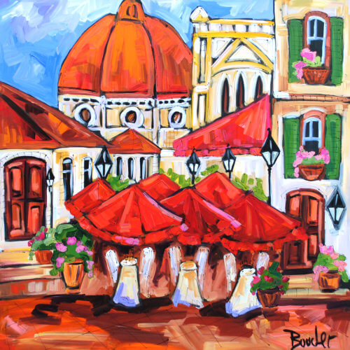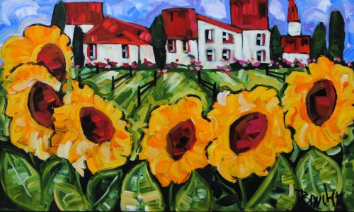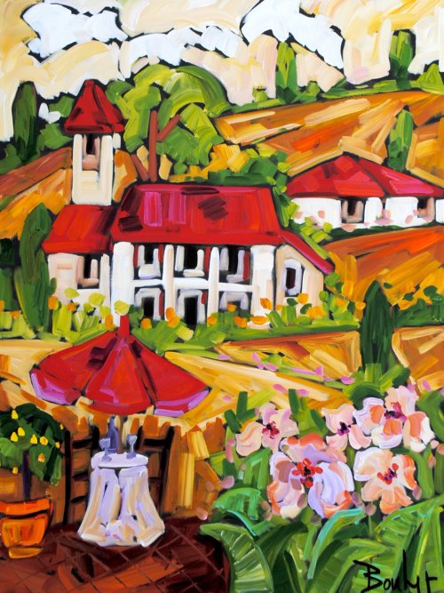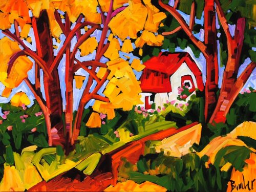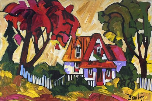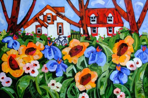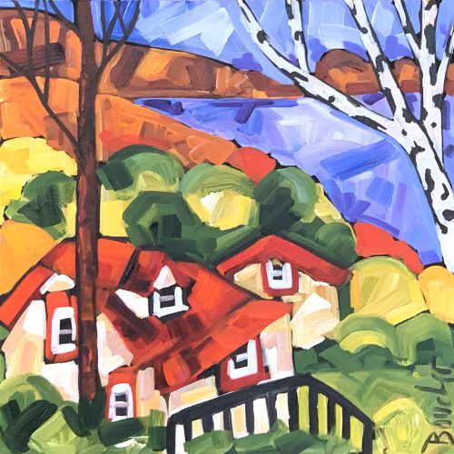 MARIE-CLAUDE BOUCHER was born in Charny, Quebec in 1973. Her interest in art began at an early age while drawing with her twin sister, and painting has since become her true passion. Artist Marie-Claude Boucher obtained her Bachelor’s degree in Art and French Literature from McGill University. While in University, she also studied Latin, Spanish, and Education. Upon graduating from McGill, Boucher briefly pursued a career in teaching, before choosing to devote her time to painting. Marie-Claude maintains a palette of primary and pure colours. She has developed her distinct style with the use of spontaneous and confident brush strokes: “I am not looking for perfection in the details, but rather simplicity in my settings.” It is in the countryside where she finds her inspiration, often interpreted through welcoming red-roofed houses and characteristic clotheslines. The liveliness in her painting style allows us to appreciate her personal zest for the act of painting, and her colourful approach bears her inimitable signature. Boucher considers herself a contemporary landscape artist with an expressionist twist. Marie-Claude has been involved with many successful shows in Ontario. Her paintings adorn the covers of many greeting cards and her uplifting style has also been used to illustrate “Super Katie to the Rescue”, a children’s book that accommodates her whimsical style in a unique figurative approach. She was recently proud to announce that her paintings will soon decorate the Montreal Children’s Hospital. If you are interested in Marie-Claude Boucher paintings for sale, click the button below or call now!