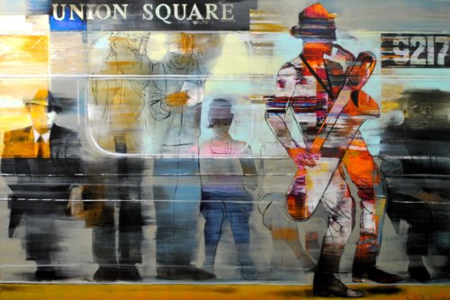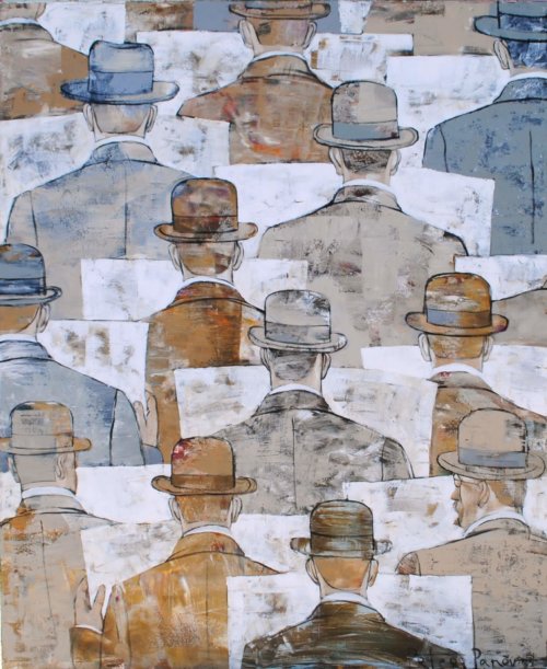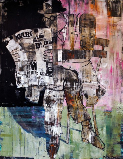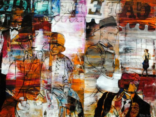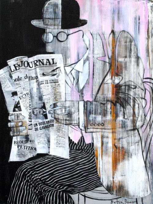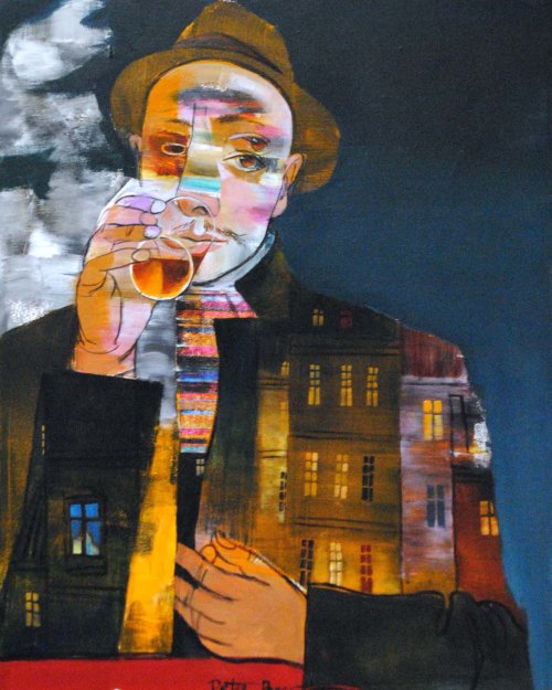 Peter Panov draws on inspiration of the past, specifically Paris in the 1920s, to create his detailed paintings of the idea of "Man and his City". He is an artist who uses textures and vibrant shades of colours to captures moments of joy and fantasy.